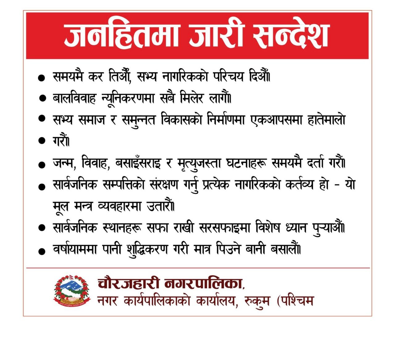बिगत(प्रमपरागत)रुपमा चल्दै आएको कागतिहार मेला रुकुम पश्चिमको चौरजहारी नगरपालिका वडा न ११ चौफा बजारमा आज सम्पन्न भएको छ यही असोज ३१ गते उद्घाटन भएको मेलामा विभिन्ना खेलकुद कार्यक्रमहरु सम्पन्न भएका छन स्थानीय खुल्ला पालिका स्तरीय भलिबल प्रतियोगिताको प्रथम पुरस्कार एक लाख राशि रहेको थियो दोस्रोलाई पचास हजार र तेस्रो तथा सान्तोना पुरस्कार बीस बीस हजार रहेको थियो प्रतियोगितामा गाउँका युवा, विद्यार्थी र सर्वसाधारणको उल्लेखनीय सहभागिता देखिएको छ। बिहानदेखि साँझसम्म खेल हेर्न मानिसहरूको भीड लाग्ने गरेको छ।